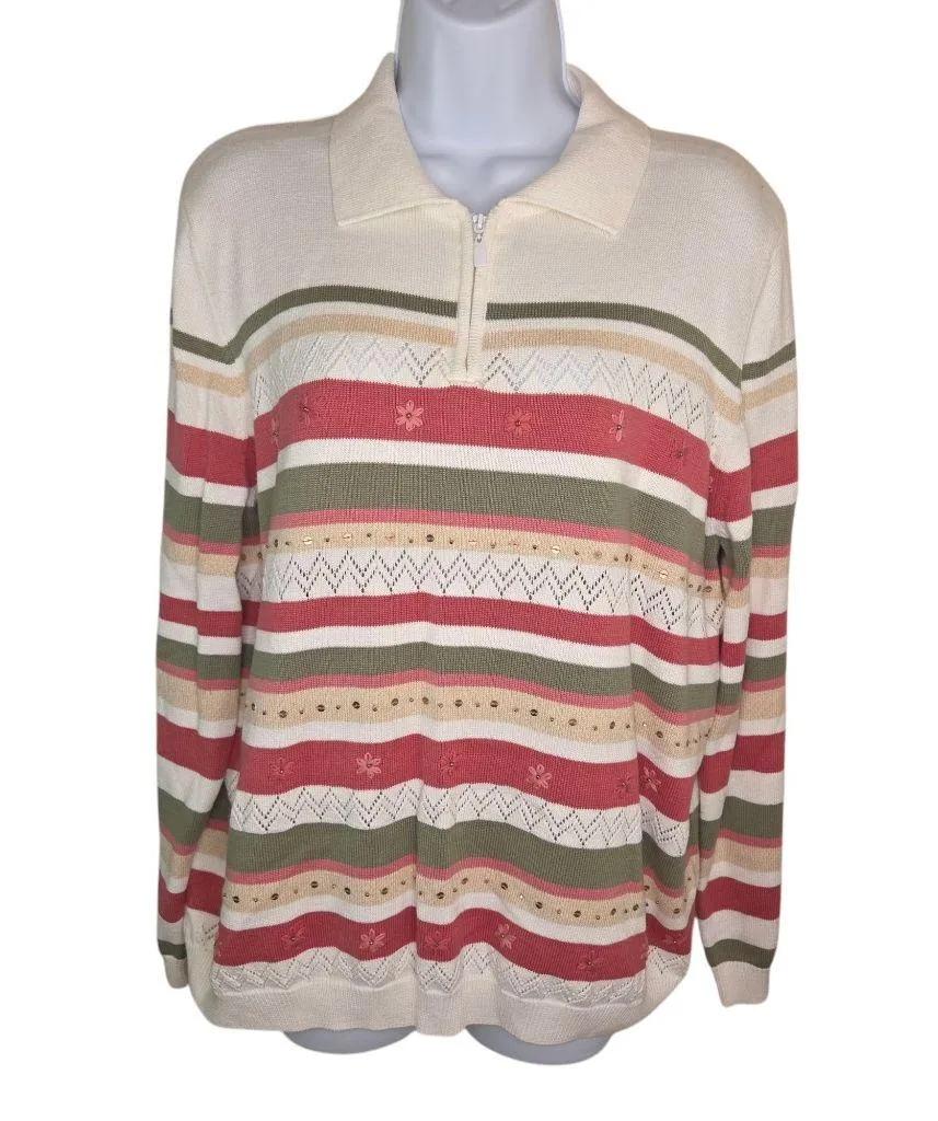 New without tags. Women's Alfred Dunner NWOT striped Floral Sequin Pullover Sweater Size XL. long sleeve 1/4 zip collared beaded and sequin detail embroidered flowers All measurements are approximate Bust 44" ptp 22" Length 26"