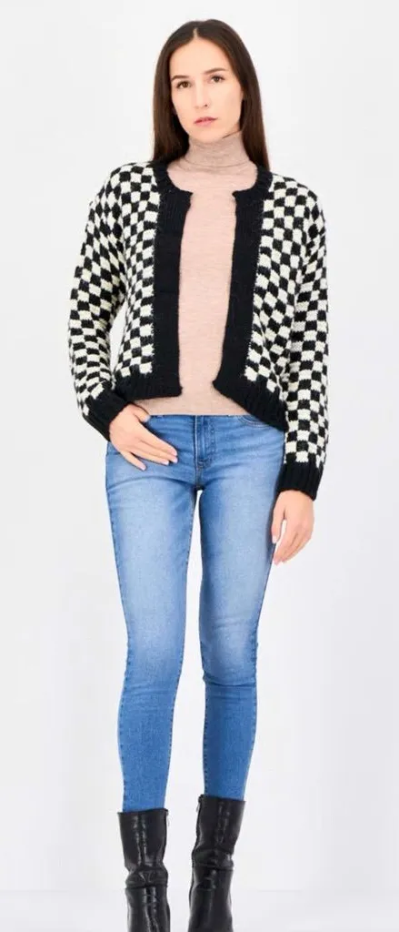 Comfy, Cozy and stylish waist length cardigan sweater. It has a Fuzzy textured in a black and white... Show more