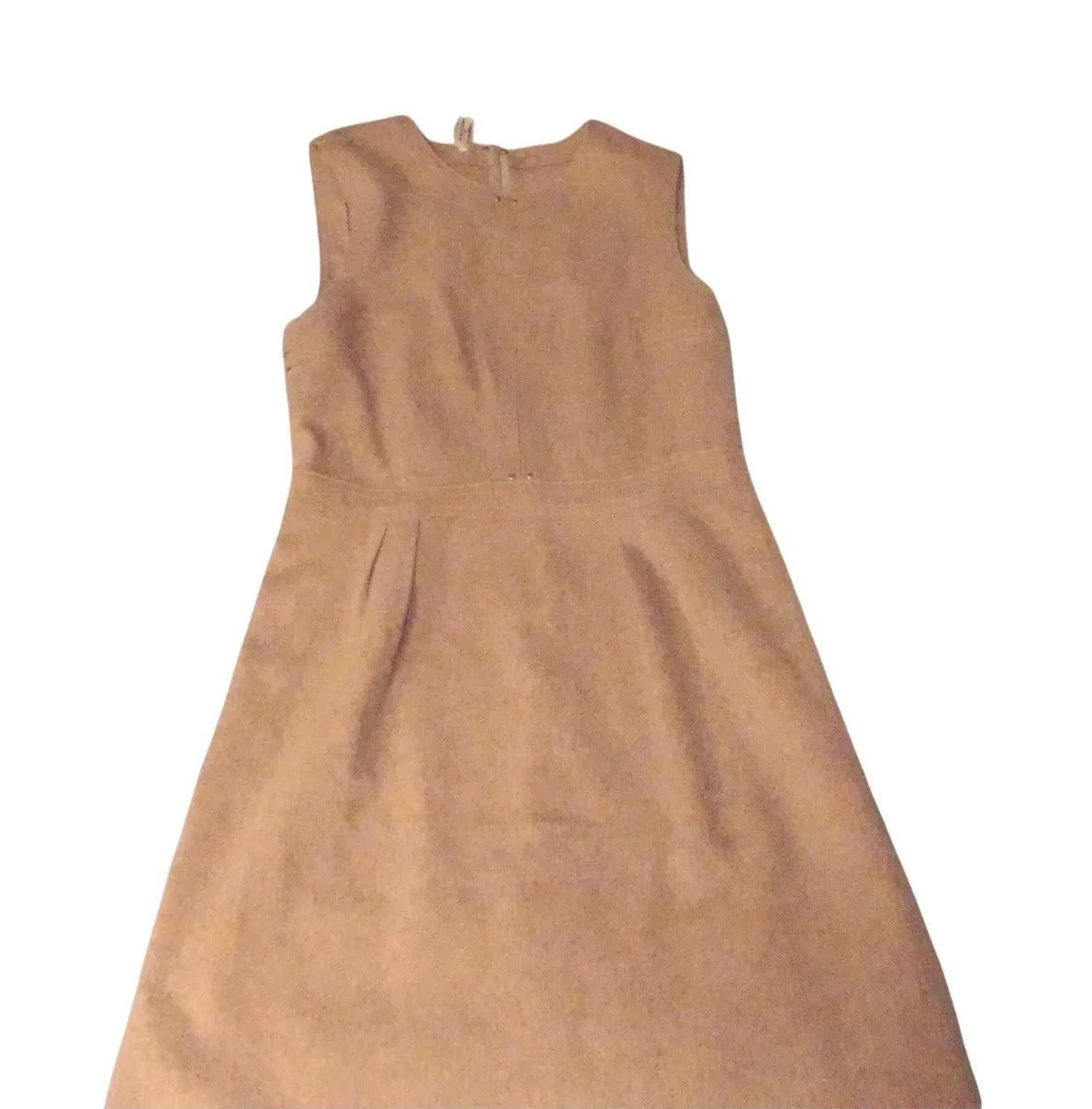 This elegant dress features a flattering A-line silhouette, a defined waist with subtle stud accents, and a concealed zipper closure at the back. The neckline is a classic round cut, and the dress is fully lined for a polished finish. Style: A-Line Dress Length: Midi Department: Women Sleeve Length: Sleeveless Pattern: Solid Occasion: Casual, Party/Cocktail Material: Suede Fabric Type: Woven Theme: Designer Neckline: Round Neck Season: Fall Sleeve Type: Cap Sleeve Closure: Zip Accents: Studded, Pleated Features: Lined Country of Origin: Italy Keywords: Alberta Ferretti, sleeveless dress, tan dress, A-line, stud detail, Italian fashion, classic dress, minimalist, chic, sophisticated, lined dress, workwear, smart casual