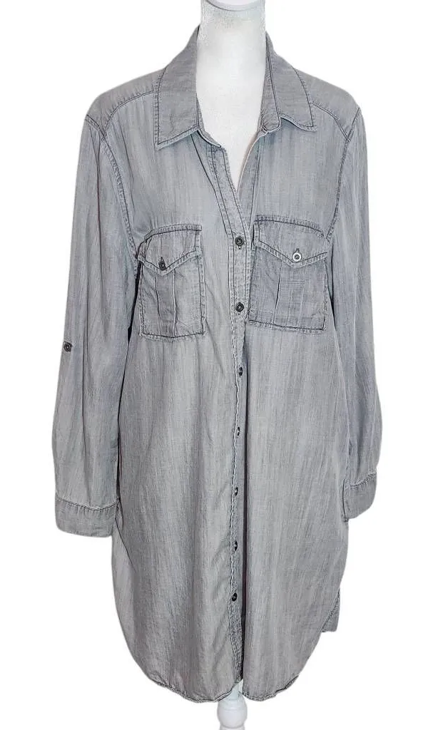 Philosophy gray chambray shirt dress with long roll-tab sleeves, two chest pockets, pockets, and a l... Show more