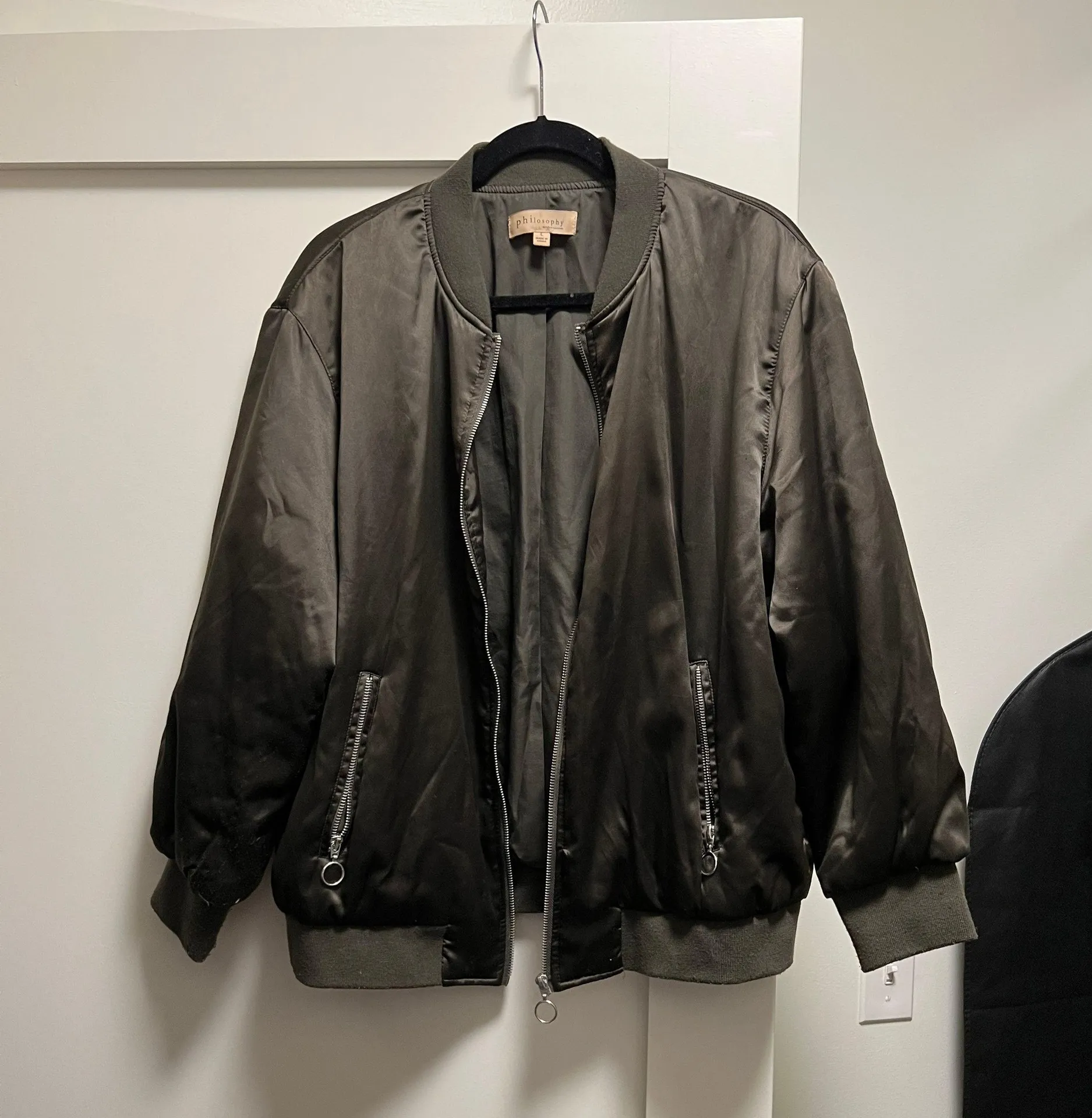 Philosophy green silk bomber, size large. Used with some pilling, please see pics for condition. Sup... Show more