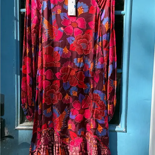 Elegant long sleeve dress with vibrant floral patterns. Features rich red and purple tones. Perfect... Show more