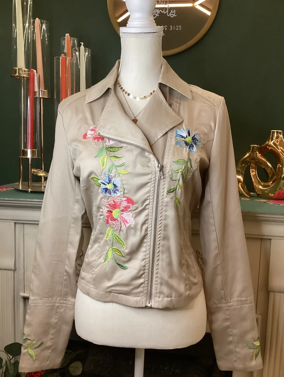 Elevate your style with this stunning Philosophy Republic Clothing moto jacket. Intricate floral embroidery bursts with color across the smooth beige fabric, adding a touch of artistry to a classic silhouette. The polished zipper and lapel create a chic, edgy vibe, while the embroidered cuffs echo the vibrant blooms. This jacket is perfect for adding a feminine flourish to your everyday look or dressing up for a night out. Type: Jacket Outer Shell Material: Lyocell Style: Biker Lining Material: Lyocell Theme: Flower, Motorcycle Accents: Embroidered, Zipper Pattern: Floral Season: Spring, Fall Closure: Zip Fit: Slim Keywords: moto jacket, embroidered, floral, beige jacket, women's fashion, designer jacket, spring fashion, fall fashion, statement jacket, unique embroidery, chic outerwear, stylish, fashionable