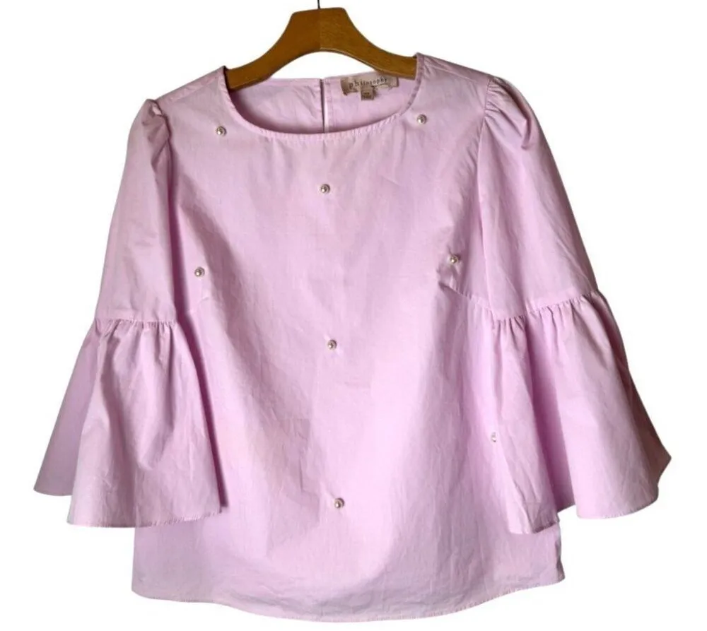 Enhance your wardrobe with this charming Philosophy blouse. Crafted from soft 100% cotton it features elegant bell sleeves and delicate pearl accents that add a touch of sophistication to any outfit. Ideal for those seeking comfort and style in one.