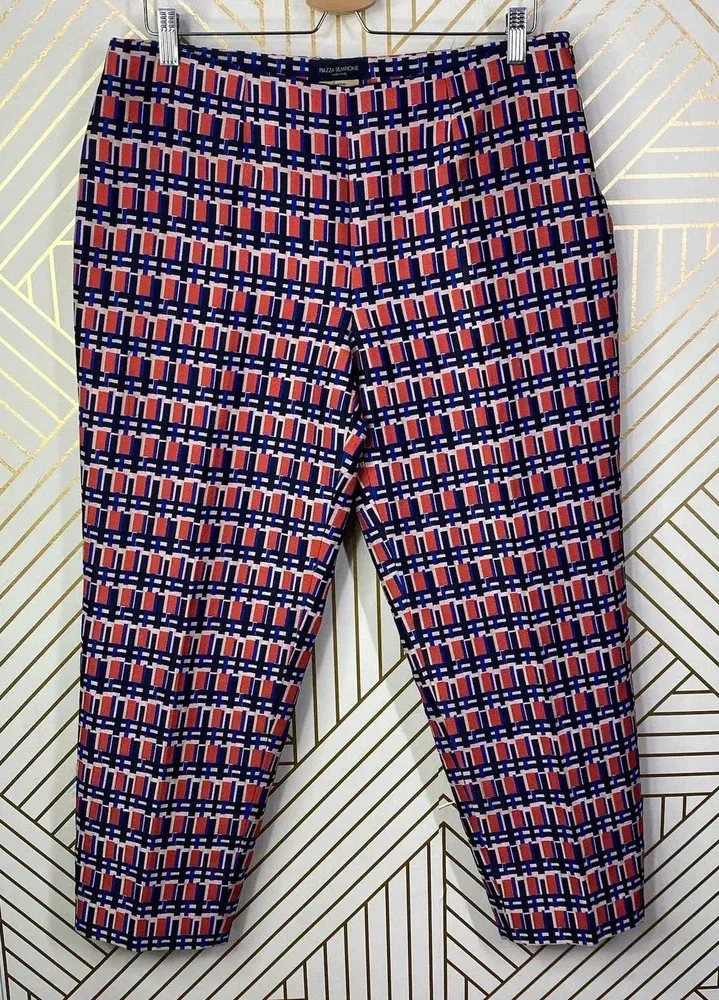 Piazza Sempione Audrey Pants in Pink & Navy Blue. Tapered cropped leg offer a polished appeal to these seamless trousers, creating a go-to workwear look. Geometric abstract pattern in pink and blue Straight-leg Side zip Split cuffs Size 46 (US 10) 83% polyester & 17% polyamide Waist is approx. 16” Front rise is approx. 11” Inseam is approx. 25”