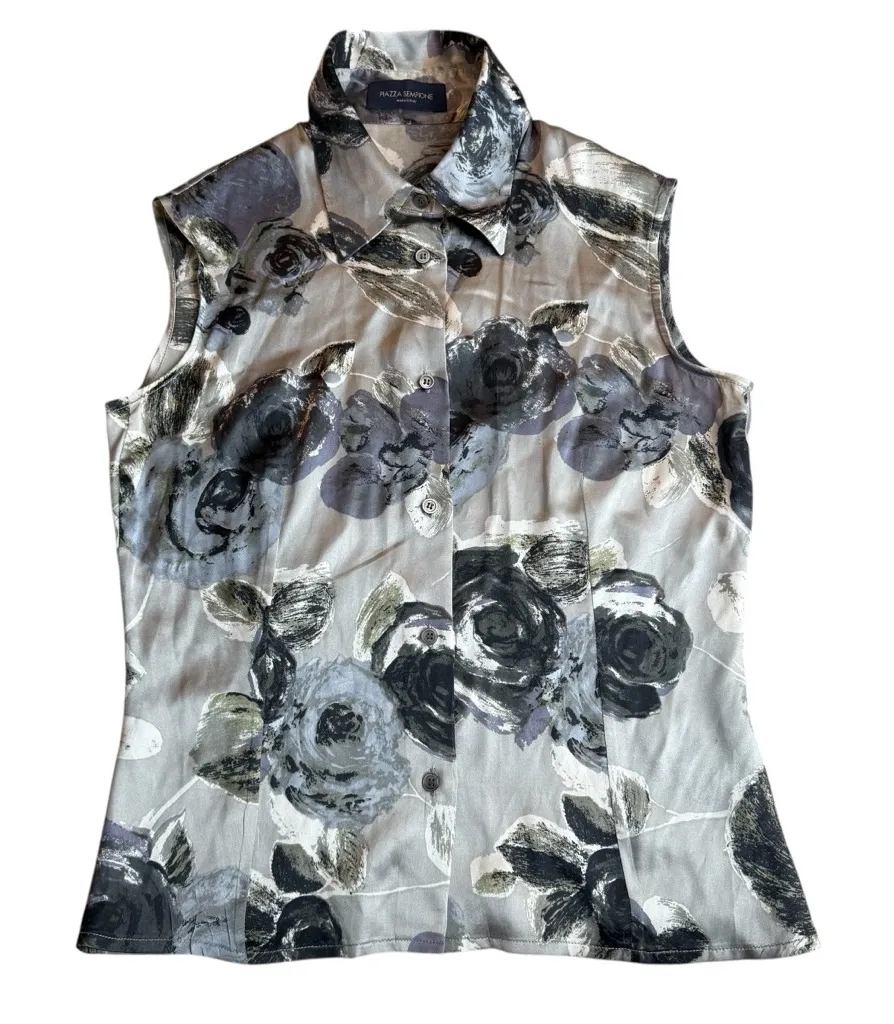 Piazza Sempione Size 2 Sleeveless Silk Button Up Vest Gray Rosette Floral Print IT size 38 = US 2/X... Show more