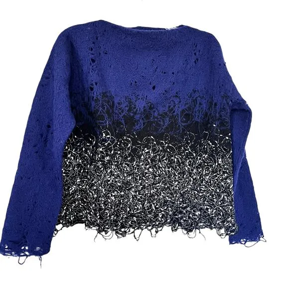 /US 6-8 Size: IT 42/US 6-8 Color: Blue, Black, and White Long sleeves Round funnel neckline Ombre Pullover Yarn embroidery knit Intentionally tattered hems Wool and nylon blend Great condition