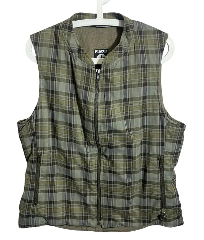 Size 44 US (fits like a large- see approximate measurements) Pit to pit- 21.5” Shoulder to hem- 26” A vintage, rare find. Excellent condition, just shows some wear on the zipper pull. But zippers all work great. Green plaid with gray/black