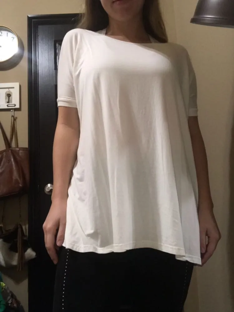 The perfect plain white tee! Goes great with leggings! Has a small stain shown in the last picture b... Show more