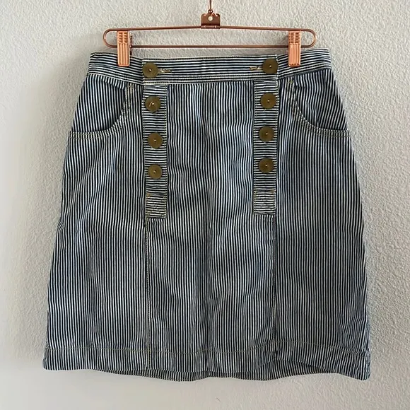 Anthropologie Pilcro Railroad Print Light Denim Vibe Skirt Preowned. Size: US 4 Waist: 14" Length: 19.5" Measurements are approximate and taken flat. 100% Cotton ITEM 0341 striped, railroad, casual, boho, blue white, elevated