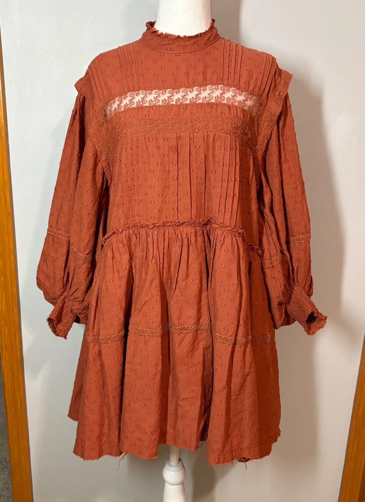 EUC with no rips, stains or flaws NO SIZE TAG measures to be a small to medium Customer return so price tag attached reflects a size but it is not confirmed Measurements are approximate. Slight color variations may be seen in pictures due to lighting and camera settings. please see measurements to determine fit. Non smoking dog friendly home Style: Mini, A-Line Dress Length: Mini Color: Brown Department: Women Sleeve Length: Long Sleeve Pattern: Polka Dot Occasion: Casual, Travel, Party/Cocktail Material: Cotton Neckline: Mock Neck Character: Bohemian, Cottagecore, Prairie, Romantic, Rustic Fabric Type: Woven Season: Fall, Spring Keywords: PILCRO, mini dress, swiss dot, mock neck, long sleeve, pockets, rust, bohemian, boho, casual dress, tiered dress, lace detail, fall dress, autumn dress