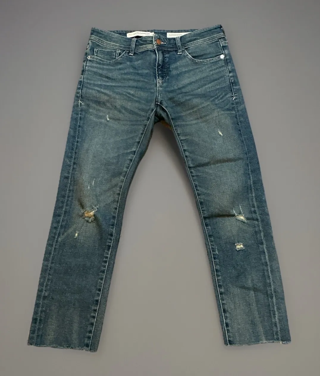 Embrace a relaxed yet stylish vibe with these effortlessly cool jeans. Washed denim lends a lived-in, vintage appeal, while the strategically placed distressing adds a touch of edgy charm. The slim boyfriend cut offers a flattering silhouette, comfortable enough for all-day wear. The raw hem adds a contemporary twist, perfect for showcasing your favorite footwear. These jeans are ideal for casual weekend outings, laid-back coffee dates, or even a stylish concert look. Measurements: • Inseam: 25 inches Style: Boyfriend Color: Blue Department: Women Type: Jeans Fabric Wash: Medium Accents: Button Features: Distressed, Raw Hem, Pockets, Slimming, Stretch Waist Size: 26 in Fit: Slim Pattern: Solid Fabric Type: Denim Inseam: 25 in Material: Cotton Closure: Button, Zip Keywords: Pilcro, Anthropologie, Slim Boyfriend Jeans, Distressed Jeans, Raw Hem Jeans, Women's Jeans, Denim, Size 26, Casual Jeans, Fashion Jeans, Designer Jeans, Vintage Wash