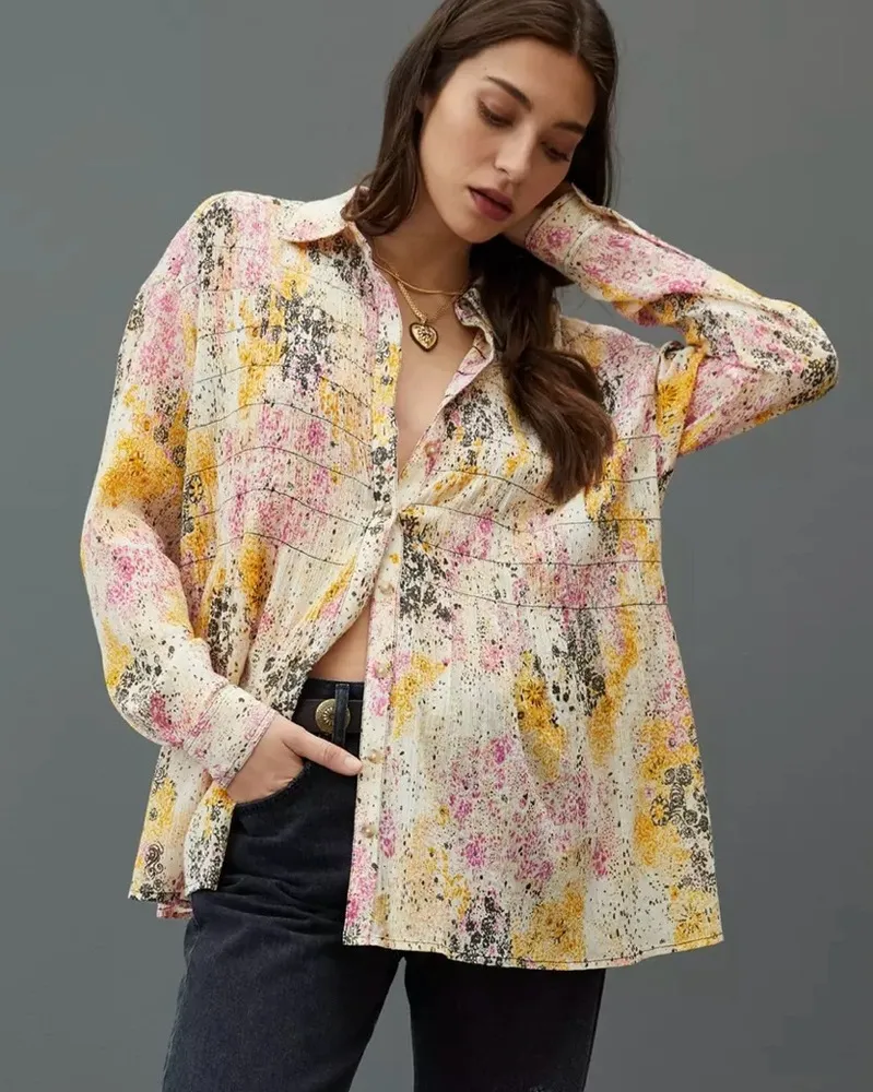 Pilcro | Anthropologie Smocked Buttondown Blouse Women’s Size XXSP. Long sleeve with button cuff, oversized fit, lightweight. Very good preowned condition. Approximate measurements 27” top of shoulder to hem, 22” across chest.