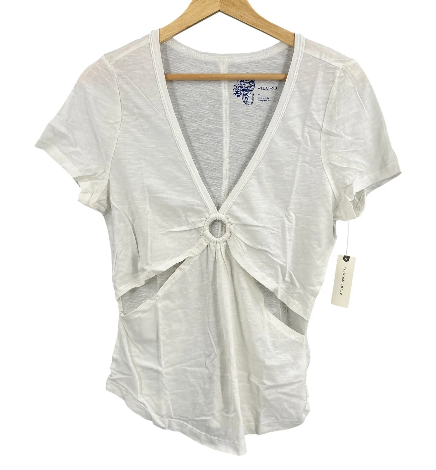Pilcro by Anthropologie white cotton top with deep V-neck, cutout front, and gathered O-ring detail. Super flattering and lightweight, made from 100% cotton with subtle texture. Size Medium. New with tags. Measurements: Armpit to armpit: 18" Length: 23" Keywords: Pilcro, Anthropologie, T-shirt, O-Ring, Cutout, Ivory, White, Short Sleeve, Tee Top, Casual, Medium, Cotton, Summer, Bohemian, Boho