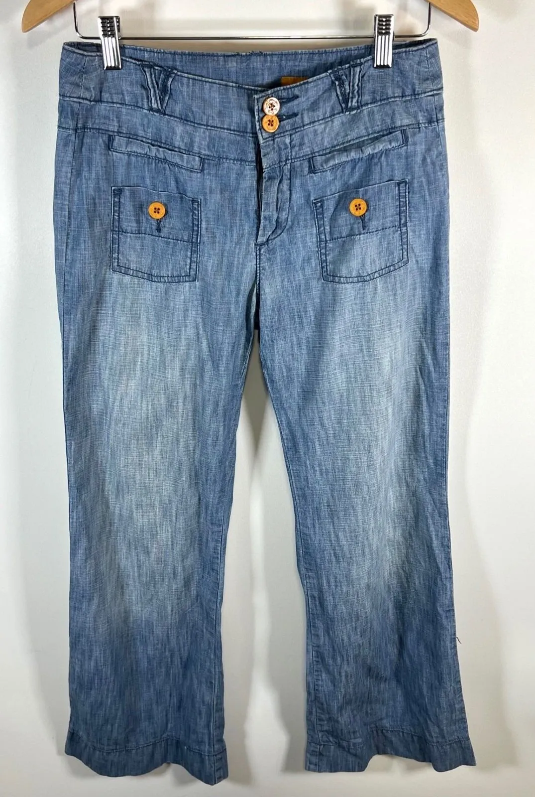 Discover effortless style with these Pilcro by Anthropologie wide-leg cropped jeans. The soft, washed denim offers a relaxed yet polished look, perfect for everyday wear. Detailed with unique orange button accents on the front patch pockets and a flattering high-waisted silhouette, these jeans bring a touch of vintage charm to any outfit. The subtle flare at the hem adds a fashionable flourish, creating a silhouette that's both comfortable and chic. Imagine pairing these with a simple tee and sandals for a casual weekend outing or dressing them up with a blouse and wedges for a brunch date. Waist-15.5 inches Inseam-28 inches Style: Flared Department: Women Fabric Wash: Medium Type: Jeans Accents: Button Features: Pockets Fit: Classic Pattern: Solid Rise: Mid (8.5-10.5 in) Fabric Type: Denim Material: Cotton Blend Closure: Button Season: Spring, Summer Pocket Type: Cargo Pocket, 5-Pocket Design Unit Type: Unit Keywords: Anthropologie, cropped jeans, wide leg, denim, high waist, vintage inspired, orange button, flared hem, casual, chic, everyday wear, brunch outfit, weekend style
