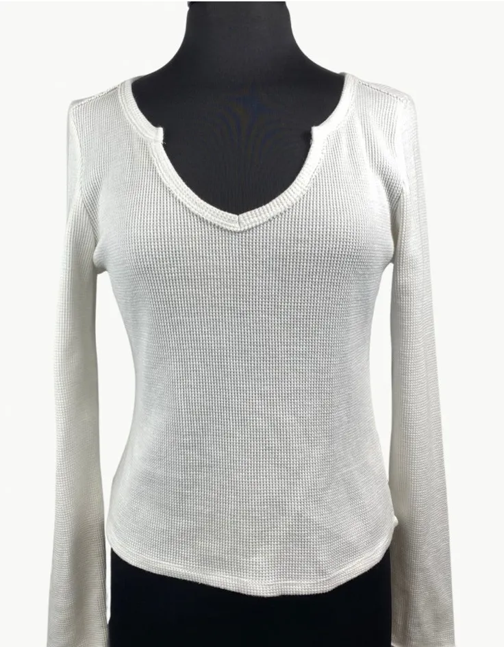 ❀ Details Condition: Gently Worn Pre-owned with minimal signs of wear No major flaws, well maintained Size: Medium Color(s): White Retail: $68 Thick & cozy waffle knit fabric Notch collar detail Seam detail at cuffs Fitted Imported ❀ Sizing Details Measurements are approximate Chest: 18" (Measured flat, armpit to armpit) Length: 21.5" (Shoulder to hem) Sleeve: 25.5" (From shoulder seam to cuff) ❀ Materials & Care Materials: 60% Cotton 40% Polyester Care: Machine wash, Lay flat to dry ❀ Smoke-Free Home: All items stored with care ❀ Stock photos for styling inspo: See item photos for details ❀ Woman-Owned | 5-Star Seller