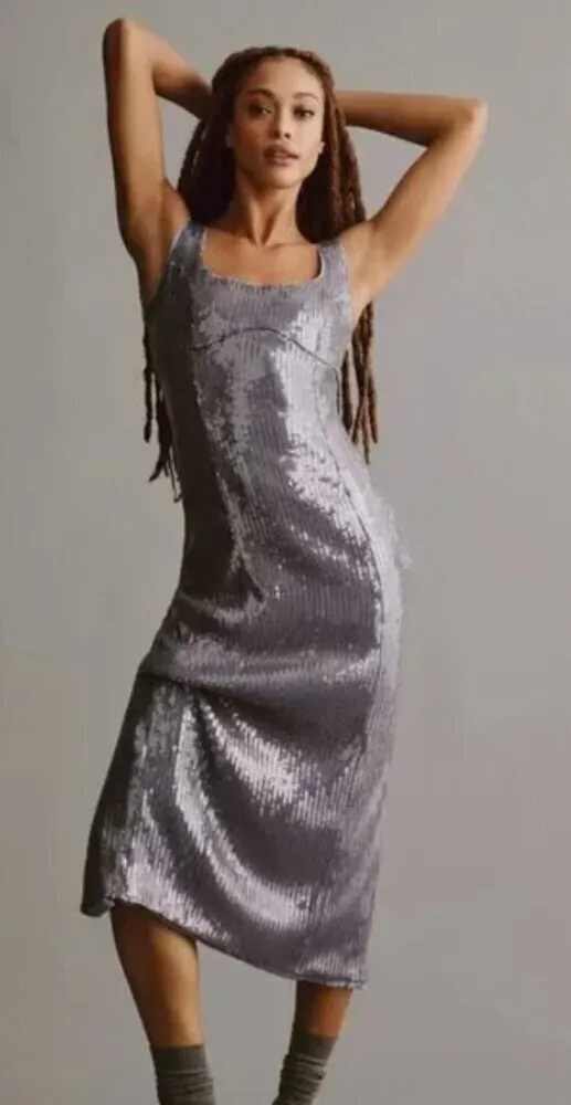Brand new with tags! Never worn — only displayed in a retail environment. Excellent condition. Shimmer in style with this stunning Pilcro Sequin Slim Midi Dress from Anthropologie. Designed in a light blue-gray hue, this sleeveless dress features subtle stretch for a flattering, body-skimming fit and elegant zipper styling. Perfect for parties, holiday events, or evening occasions. Polyester and elastane blend with gentle stretch Sleeveless silhouette Zipper back closure Midi length design Sequin-covered fabric n Approximate Measurements (laying flat): Length (strap to hem): 51" Pit to pit: 20.5" Waist: 17.5" Tags: pilcro, anthropologie dress, sequin dress, midi dress, slim fit, sparkly, holiday outfit, cocktail dress, blue gray dress, sleeveless, party dress, elegant style, shimmer, occasionwear, special event, festive, evening dress, formal, chic, statement look, trendy, women's fashion, flattering fit, modern elegance