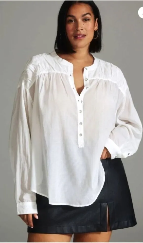 This versatile button-down blouse features a relaxed fit and lightweight cotton fabric, combining classic structure with a touch of feminine elegance for everyday wear. Features: • Crew Neckline • Pleated Details • Long Sleeves with Button Cuffs • Oversized, Boxy Fit • Half Button Front Placket • spring, fall, winter, summer • solid • hand wash • Cotton & Viscose Blend • Round Hemline • Dropped Shoulder Measurements: armpit to armpit 21 in / 53 cm length 24.5 in / 62 cm sleeve 19.5 in / 50 cm Great Pre-Owned Condition. (see pics for details) designer, luxury, cotton blend, anthro, anthropologie, peasant, boho, bohemian, cottagecore, festival, hippie, gorpcore, henley, flowy, oversized, boxy, cotton, whimsical, dainty, romantic, casual, classic, corpcore, career, sophisticated, business, careerwear, academia, businesscore, Designer, Casual, Winter, Spring, Fall, Summer, Classic, Classy, Elegant, Smart Casual, Preppy, Bohemian, Boho, Folk, Loose, Wmns, Anthro, Size 0, Size 2
