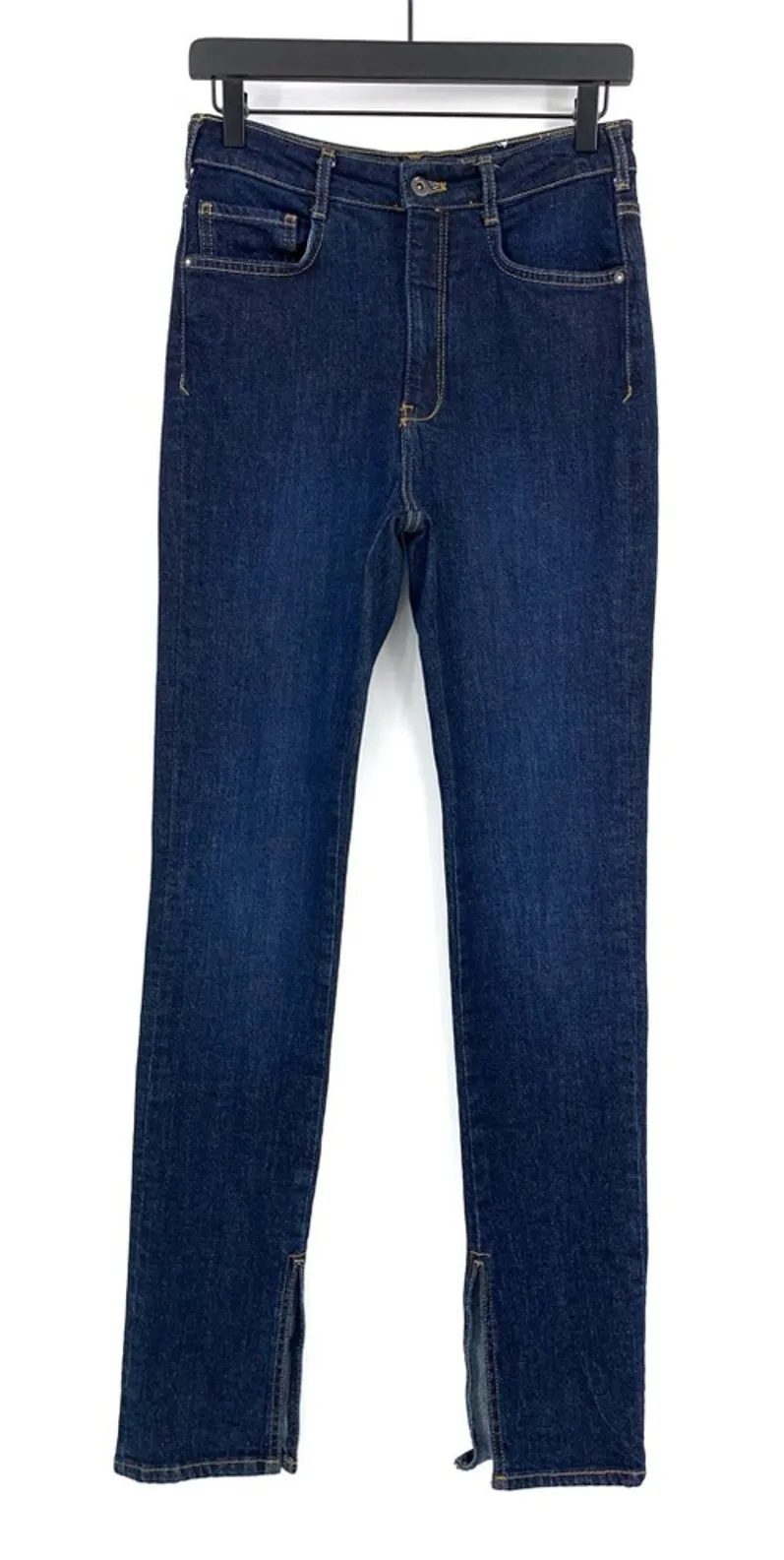 Pilcro & The Letterpress The Split Straight Jeans in a dark blue denim wash. Not stretchy, legs are very skinny and slim. Zipper closure, standard skinny silhouette. Slit up the inner ankle. Great condition! OB1438298 Waist: 14" Rise: 11" Inseam: 32" Slit: 7" Pre-Owned: Very Good