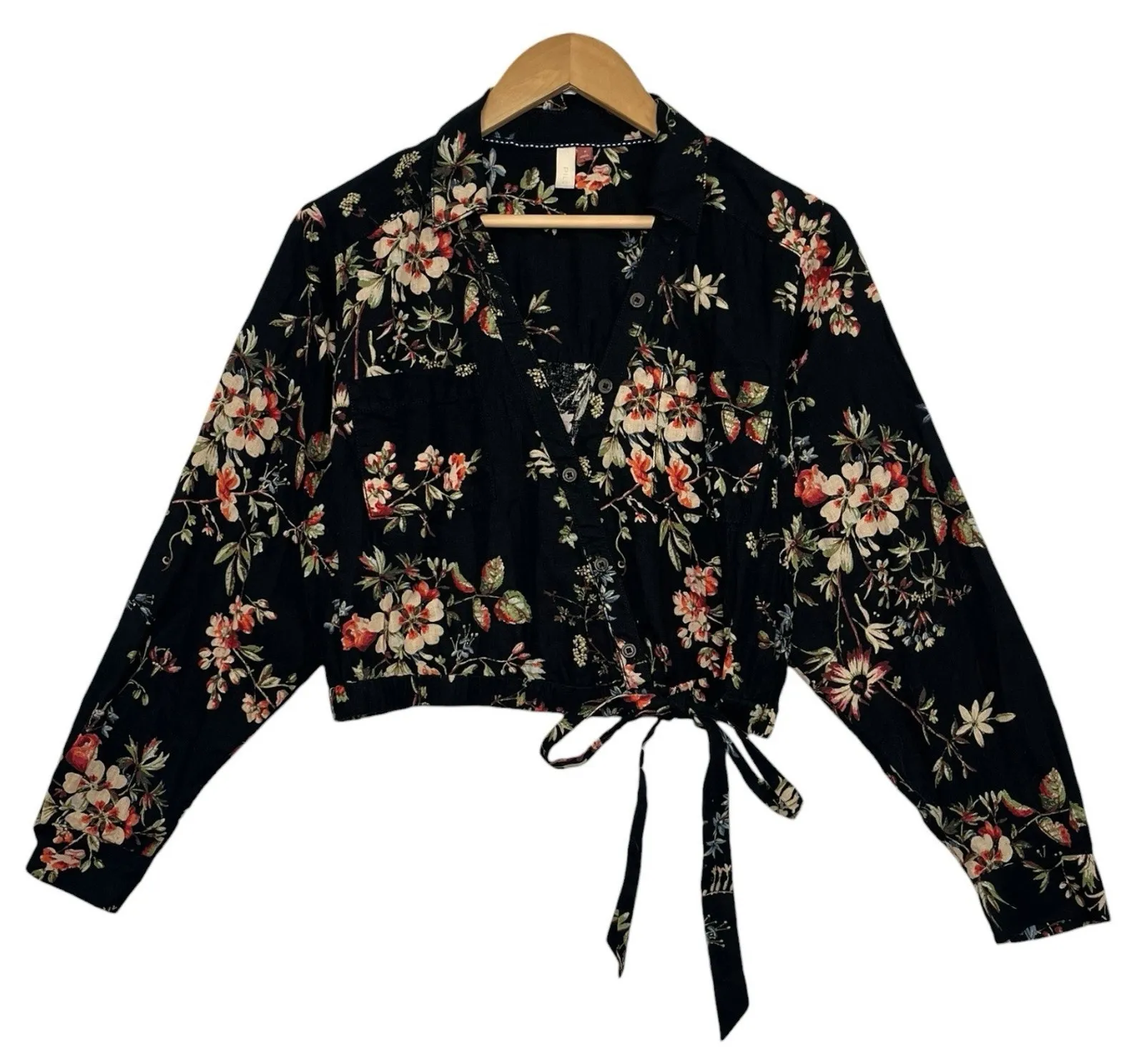 Pilcro Top Womens Small Black Floral Linen Casual Faux Wrap Top Boho Cottagecore Boho cottagecore floral casual lightweight wrap top Measurements Bust: 19 inches Length: 17 inches Brand: Pilcro Size: Small Color: Black Pattern: Floral Material/Fabric: Linen Viscose Blend Sleeve Length: Long Sleeve Fit: Relaxed Gender: Womens Type: Blouse Excellent pre-owned condition - see pics and ask questions for more details. Lightweight Pilcro wrap-style blouse featuring an allover floral print on a black ground. Designed with a cropped silhouette, adjustable side tie waist, and long sleeves for an easy relaxed fit. Linen blend fabric offers breathable comfort with a soft drape, making it ideal for casual wear, layering, or transitional seasons. A versatile piece that pairs well with high-rise denim or skirts. SKU: 3630