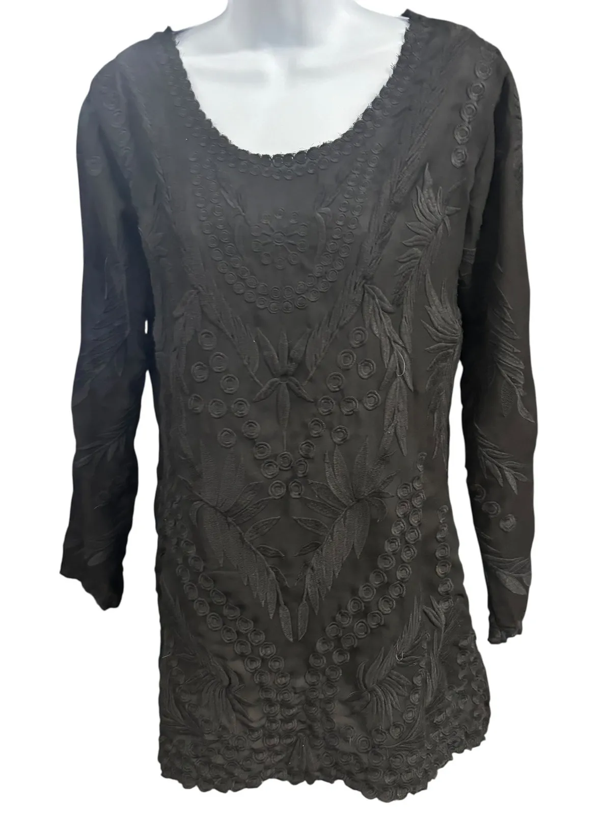 Elegant black tunic dress adorned with intricate embroidery. This dress features a rounded neckline and long sleeves. The detailed embroidery, present on both the front and back, showcases a symmetrical pattern of floral and geometric motifs. The hem is finished with a complementary scalloped edge, adding a touch of sophistication to the overall design. Style: T-Shirt Dress, Tunic Dress Length: Short Color: Black Department: Women Sleeve Length: Long Sleeve Pattern: Floral Occasion: Party/Cocktail, Casual Material: Polyester Neckline: Round Neck Character: Bohemian, Elegant, Retro, Sophisticated, Designer Fabric Type: Chiffon Season: Fall, Spring, Summer Keywords: PILY Q Barcelona, Tunic Dress, Embroidered Dress, Black Dress, Long Sleeve Dress, Bohemian Dress, XS/S, Designer Dress, Polyester Dress, Floral Embroidery, Evening Dress, Party Dress, Special Occasion, Casual Dress
