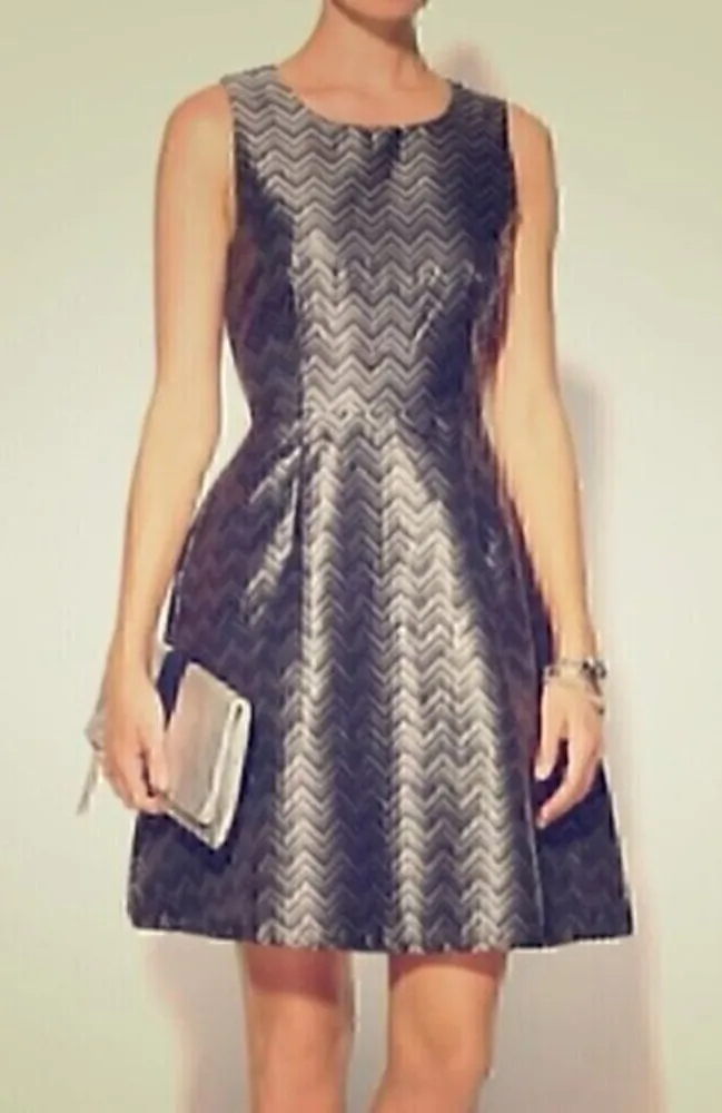 NEW WITH tags Pim + Larkin Lena Brocade Dress size small black / silver gray chevron sleeveless fit flare dress metallic ish / shiny textured woven knit lined back zipper zip 100% polyester; lining: 97% polyester, 3% spandex - hand wash, hang dry NWT; no flaws Measurements (flat): Bust: 17.5 in (Fits 35") Waist: 14 in (Fits 28") Length: 35.5 in lvn party cocktail special occasion special event holiday holidays Christmas XMas Christmas party New Years Eve NYE wedding guest preppy prep work office career professional church spring summer fall autumn winter year round girly fem feminine romantic date night girls night out anniversary