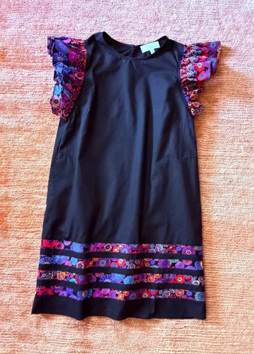 Pinch women’s black cotton shift dress in size S. Made of high-quality lightweight cotton, unlined and very comfortable to wear. Features colorful floral flutter sleeves, decorative contrast trim at the hem, and two side pockets. Excellent pre-owned condition with no visible signs of wear. Please review all photos for details.