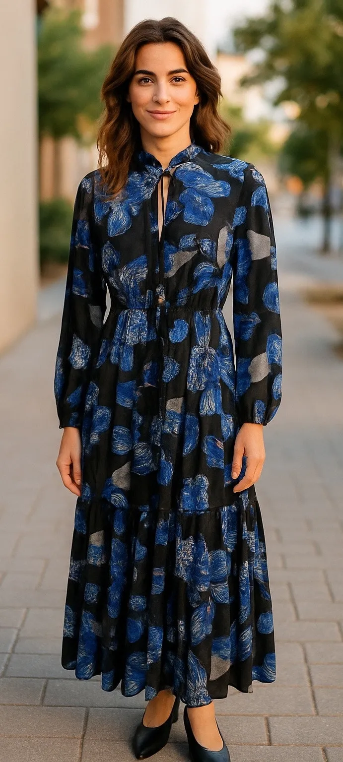 A beautiful long dress. Background in black with large floral and butterfly print in hues of blues,... Show more