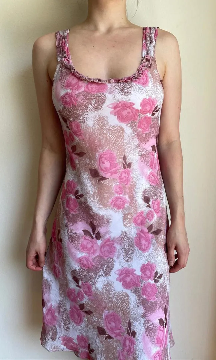 The prettiest pastel pink and white floral rose tie back dress!! Lovely frilly trim on the bodice an... Show more