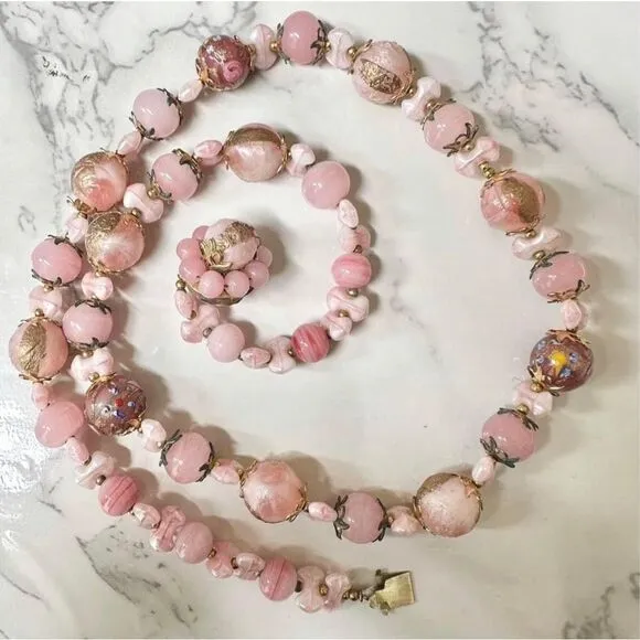 Pink art glass wedding cake vintage necklace Stunning! Gold tone accents on some beads Good vintage... Show more