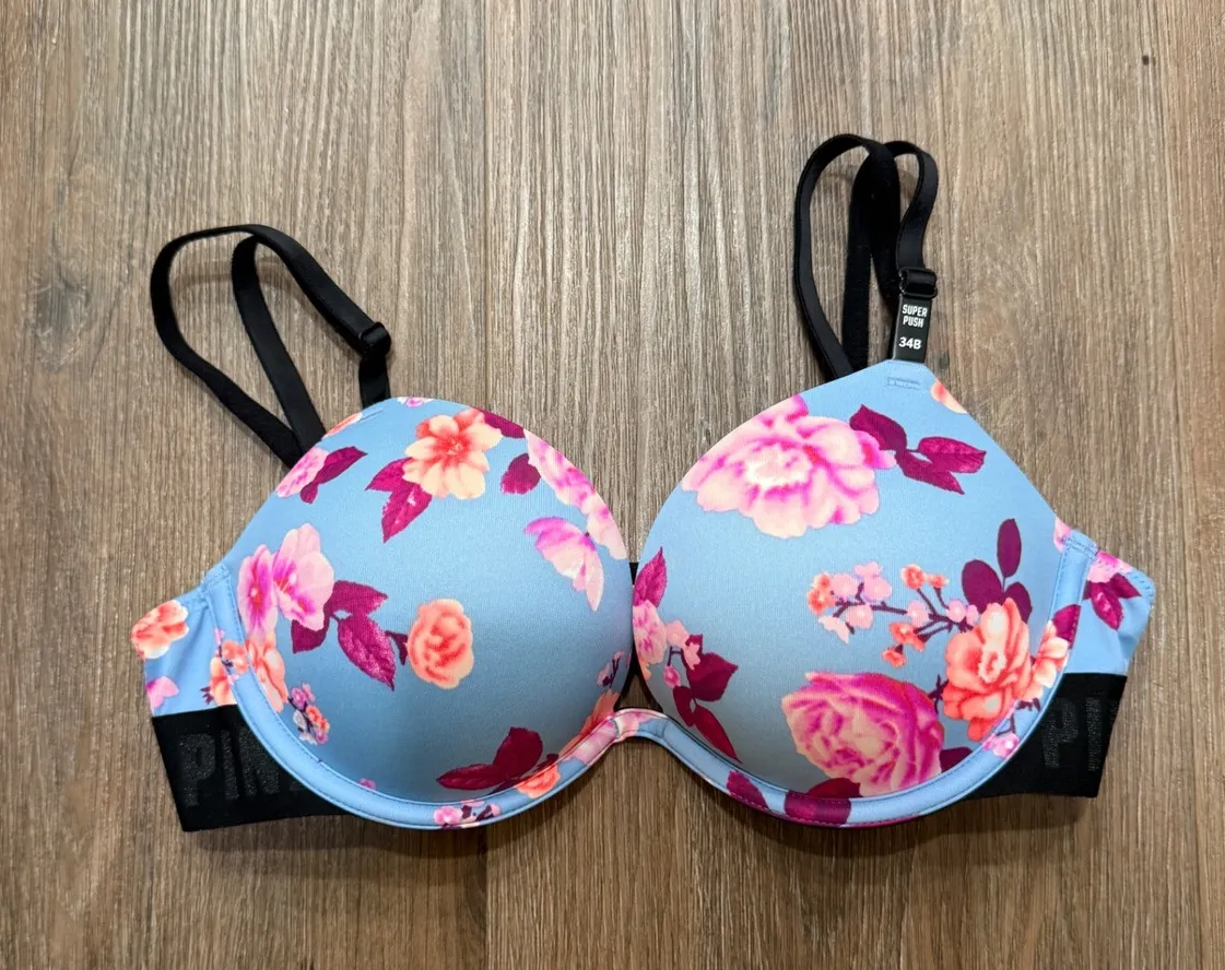 A Victoria's Secret Pink push-up bra in a vibrant blue floral print. This bra features adjustable bl... Show more