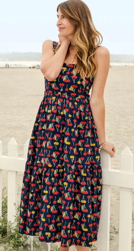 Pink‎ Chicken Sierra Dress Blue Cherries Cherry Poplin Tiered Midi Sz L Size L - $105 - From Patchworked