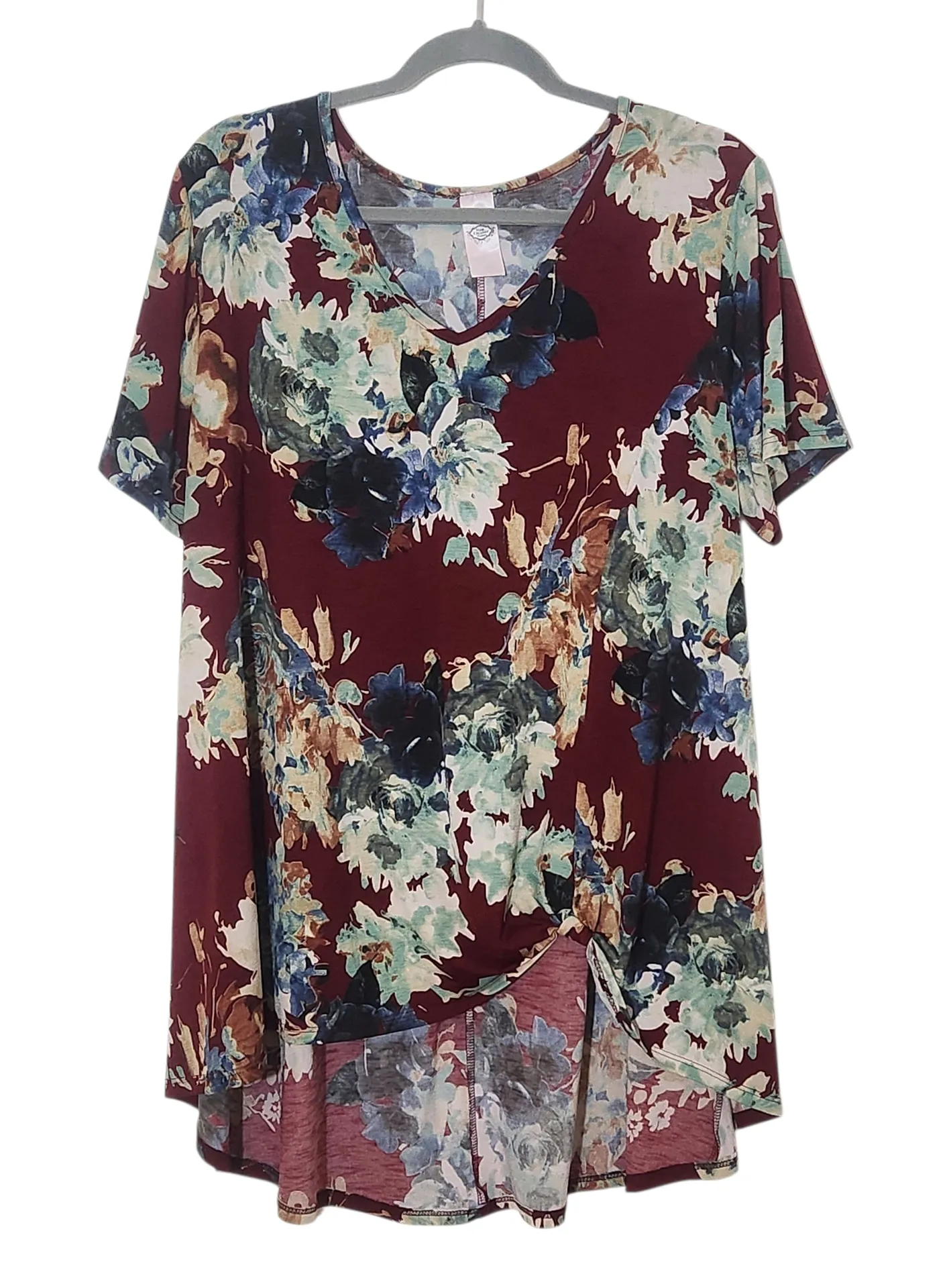 Pink Coconut burgundy floral tunic with v-neck style, some stretch, and a knot detail in the front.... Show more