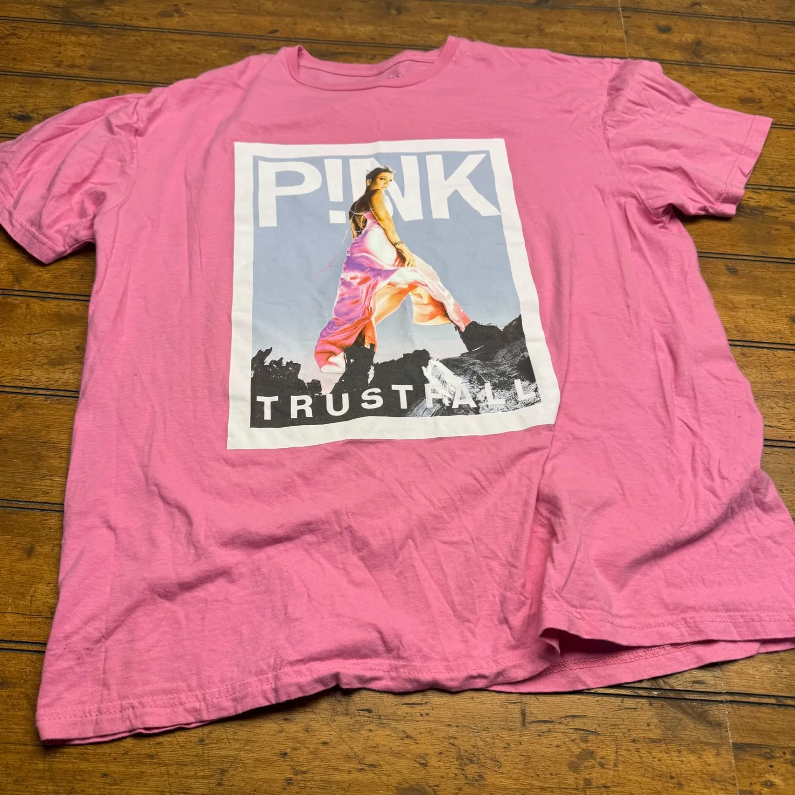 PINK graphic t-shirt featuring a bold front design with the word "PINK" and a model in a flowing dress. The back of the shirt lists song titles including "Trustfall," "Turbulence," and "Never Gonna Not Dance Again." This comfortable cotton tee is perfect for casual wear, concerts, or everyday styling. Keywords: PINK, graphic tee, pink shirt, cotton tee, band shirt, music tour, casual top, statement shirt, summer wear, streetwear, oversized fit, comfortable, artist merch