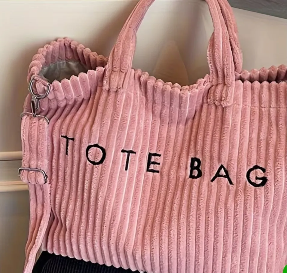 Brand new pink bag. A stylish corduroy tote bag ideal for everyday use. This spacious bag features a classic corduroy texture and a prominent embroidered 'TOTE BAG' graphic. Its generous size makes it perfect for carrying daily essentials, and it includes both comfortable top handles and an adjustable shoulder strap for versatile carrying options. This tote is well-suited for errands, casual outings, or as a chic beach companion. Exterior Material: Corduroy Style: Tote Exterior Color: Pink Department: Unisex Adults Lining Color: Gray Handle/Strap Material: Cotton Handle/Strap Color: Pink Lining Material: Fabric Hardware Color: Silver Pattern: Logo Accessories: Detachable Strap Accents: Stitching, Embroidered