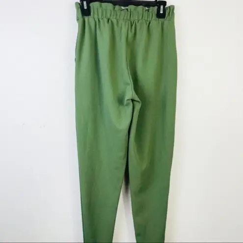 Tapered Legs, Gathered Waist, Front Tie Belt Style, 2 Side Pockets, 95% Polyester and 5% Spandex for a comfortable fit. Machine Washable garment. Color: Hunter Green Excellent pre-loved condition Size Small Approx Measurements Waist 14" Rise 11" Inseam 27" SMOKE AND PET FREE ENVIRONMENT 292