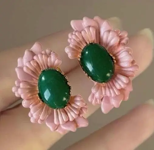 • Elegant floral clip-on earrings with pink enamel petals • Green oval stone center reminiscent of jade • Gold-tone backing with secure clip-on closure • Approx. size: 1.6 in / 4 cm long • New and unworn; no original packaging Perfect for vintage lovers or a unique statement accessory