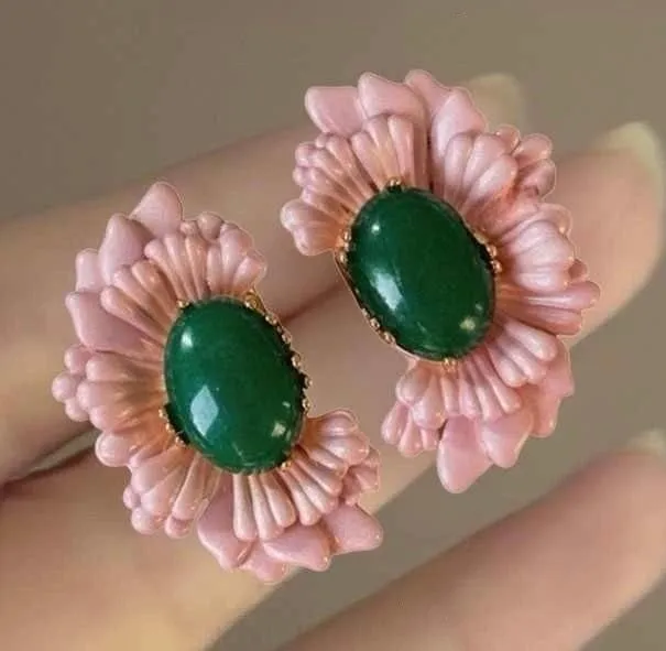 • Elegant floral clip-on earrings with pink enamel petals • Green oval stone center reminiscent of... Show more