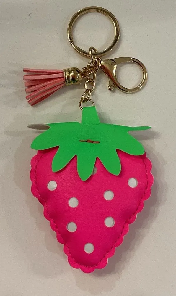 Bright pink strawberry purse charm keychain with green leaves and a pink tassel. Add a playful, fru... Show more