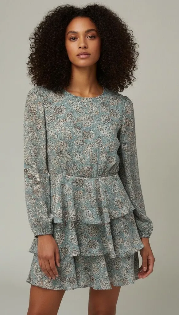 Beautiful Pink Lily long sleeve floral tiered dress in size Small. Features a dusty blue background... Show more