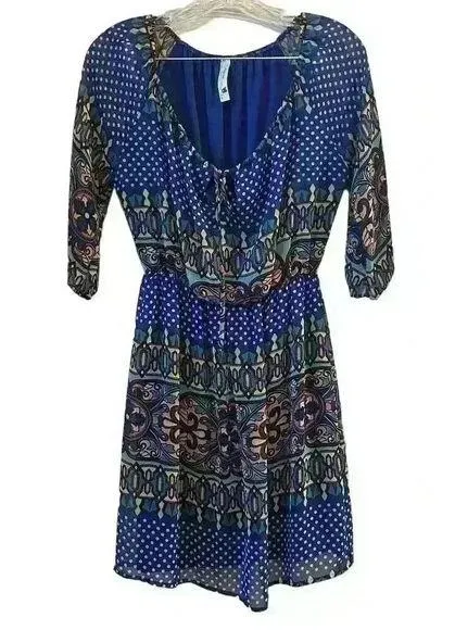 Description: The Pink Owl A-Line dress in size M features a knee-length design with a scoop neckline and 3/4 sleeves. The blue dress showcases a floral and geometric print, made from polyester, and includes a keyhole tie detail. Suitable for casual and semi-formal occasions, it is perfect for spring and summer wear. Hand wash only. Pre-owned. Keywords: Pink Owl, A-Line dress, knee-length, scoop neck, 3/4 sleeve, floral print, geometric print, casual dress, semi-formal dress, spring fashion, summer fashion, polyester dress, blue dress, keyhole tie, pre-owned dress. Brand: Pink Owl Size: M Style: A-Line Dress length: Knee Length Color: Blue Department: Women Sleeve length: 3/4 Sleeve Pattern: Floral and Geometric Print Occasion: Casual, Semi-Formal Material: Polyester Neckline: Scoop Neck Features: Keyhole Tie Detail Season: Spring, Summer Garment care: Hand Wash Only