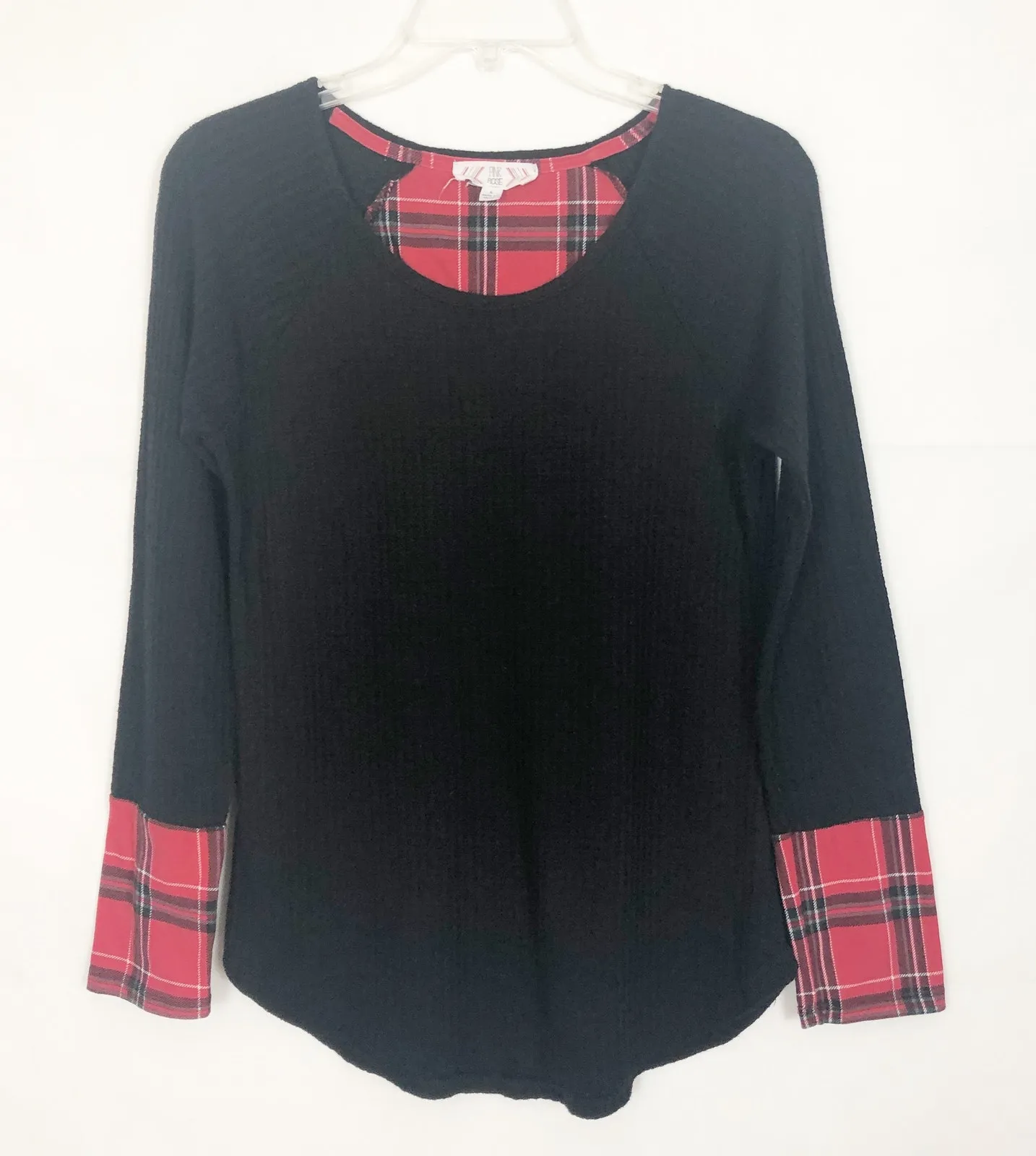 Pink Rose waffle knit black sweater with contrasting sleeves. Plaid holiday-like cuffs and extended... Show more