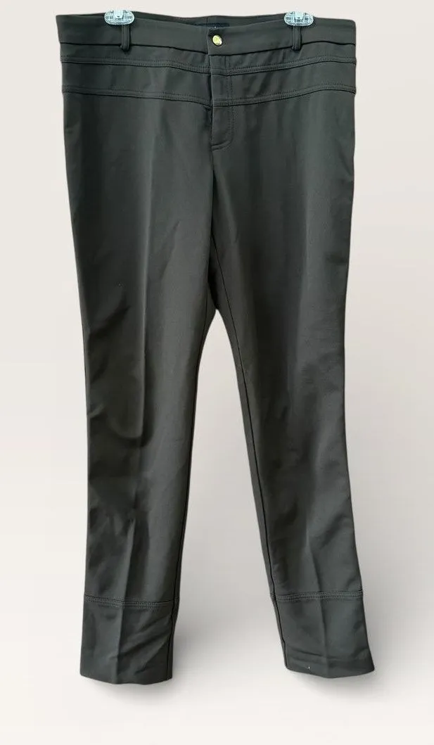 Excellent condition womens size 10 brown stretch trouser style pants, measures 17.5" across the waist, 31.5" inseam Has decorative seaming at the front, straight leg style with decorative seams at the ankle