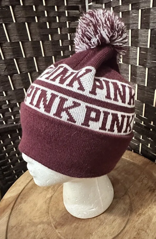 PINK Victoria's Secret Beanie Pom Pom Hat Knit Cap Burgundy & White One Size - $14 - From Angela
