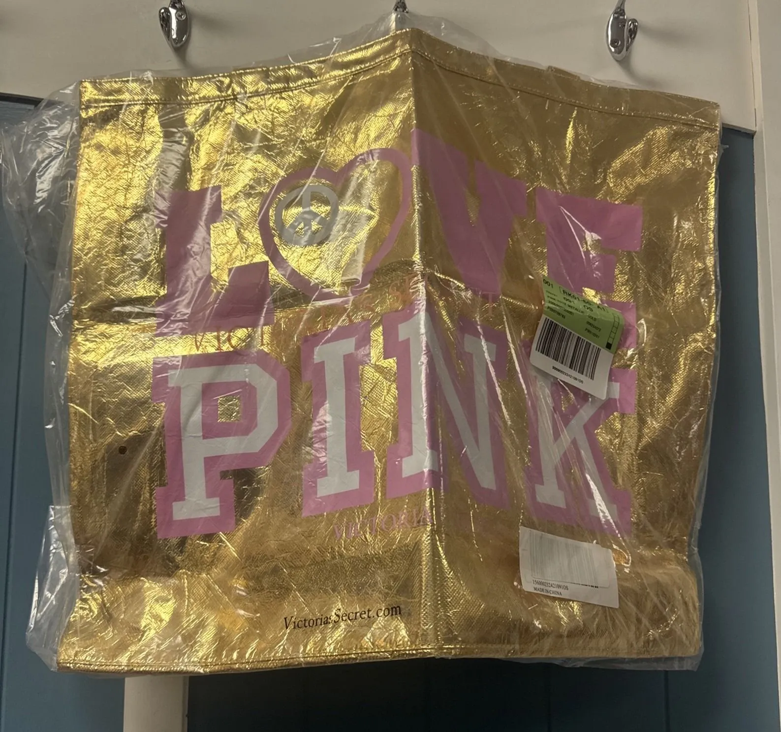 This pink Victoria's Secret tote shopping bag features a gold exterior color with pink hardware acce... Show more