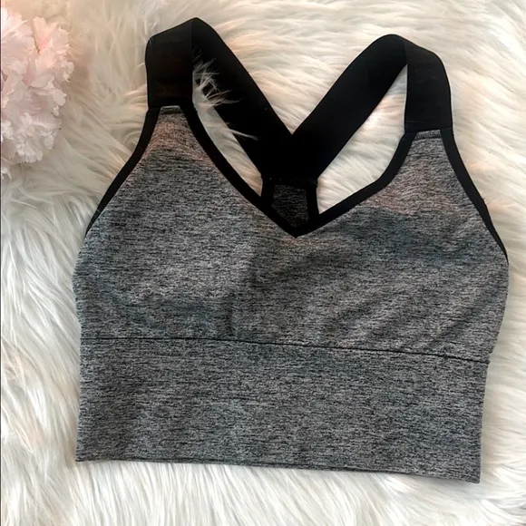 Stylish gray sports bra with black trim. Perfect for workouts. Experience ultimate comfort and supp... Show more