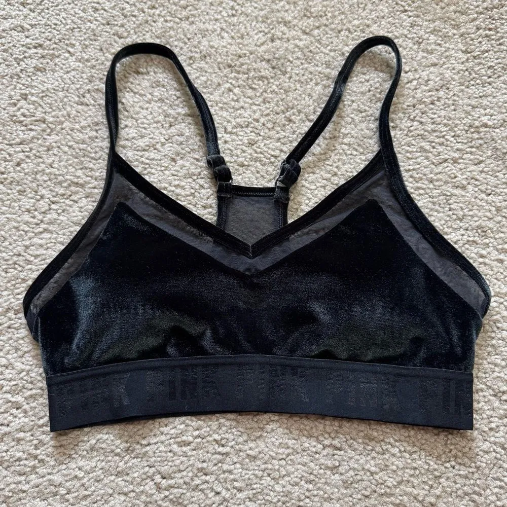 Excellent condition PINK Ultimate Lightly Lined sports bra in black velvet / velour material on the... Show more