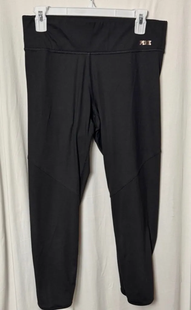 PINK Victoria’s Secret Black 7/8 Leggings with Gold Logo Size Medium 77 polyamide 23 elastane 9”... Show more