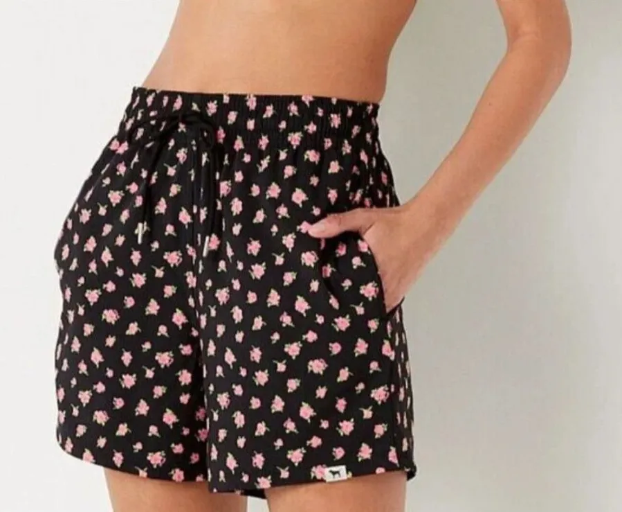 Drawstring and elastic black board shorts with a pink floral design. Perfect for casual outings. EC... Show more