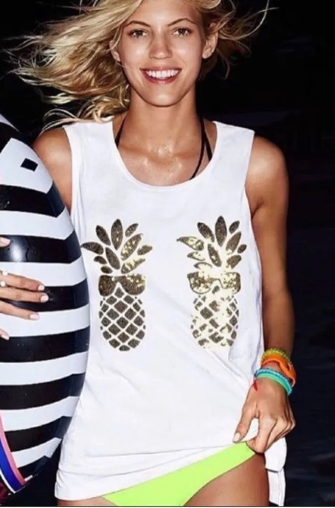 Victoria’s Secret Pink Tank Top Gold sequin pineapple design White Boxy muscle tank like fit Siz... Show more